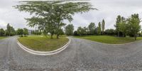 A picturesque road in South Island, New Zealand, lined with lush green trees and grass. The straight path leads to a park area with benches, offering a serene and natural environment. Enjoy the clear sky and the beauty of the surrounding landscape.