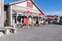 Charming storefronts of classic architecture in a residential suburb of New Zealand's North Island. Open space with tables and chairs for outdoor recreation in front of cafes and shops. Clear sky enhances the natural beauty of this suburban area.