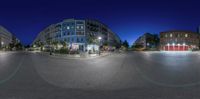 Nighttime in Berlin, a classic European city. Streets illuminated by artificial light showcase the city's architecture. Residential homes and storefronts line straight roads. City life thrives in open spaces with cafes and shops.