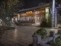 The front door and entrance of a Chinese building at night, at an intersection surrounded by greenery. Classic architecture blends with modern urban design in this vibrant city. A picturesque scene in Lijiang, Yunnan.