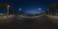 A bustling city intersection at night, illuminated by street lights. Cars traverse the asphalt roads in this metropolitan area. The fisheye lens captures the urban design and architecture, creating a dynamic and vibrant scene.