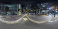 A bustling city street at night, illuminated by street lights and the glow of modern architecture. The camera lens captures the scene from a tripod, showcasing the city's vibrant urban design.