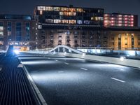This is a nighttime image of a bridge over a city street in the Netherlands. The modern architecture of the building and the high-rise condominiums are illuminated by artificial light. The road surface, made of asphalt, reflects the street lights and creates a vibrant cityscape. This urban design represents the bustling city life of Holland. The dark sky above adds to the atmosphere of the scene. This photo captures the combination of modern architecture, urban design, and the energetic nightlife in a European city.