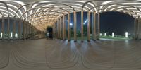 A cityscape at night with a curved structure illuminated by artificial light. Straight road lined with street lights and urban architecture. Greenery and grass surface contrast with the dark sky.