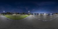A stunning night view of a city skyline, with skyscrapers illuminated by artificial lights. The clear sky provides a dramatic backdrop to the urban landscape. Street lights and the glow of city life create a captivating scene.