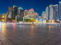 This image showcases the vibrant cityscape of Taiwan, specifically in Taichung and Taipei. The modern architecture and artificial lights create a stunning scene at night. The clear sky contrasts with the dark surface of the plaza, illuminated by street lights. The bustling city streets are lined with pavers, adding to the urban atmosphere. This photo captures the essence of Taiwan's urban life, showcasing the blend of traditional and modern elements in its architecture and cityscape.