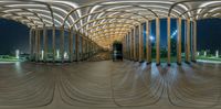 A night scene in the city with a curved structure illuminated by neon lights. The skyline reflects on the water, creating a gloomy yet captivating atmosphere. Urban design meets coastal charm.