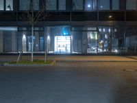 street lights are on in front of an empty parking space at night in a city