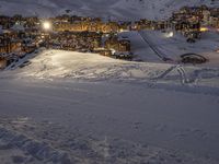 A stunning night landscape in the Alps, with snow-covered mountains and a clear sky. The artificial lights illuminate the ski slopes, creating a magical atmosphere. A popular tourist attraction in France, perfect for winter tourism.