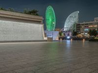Yokohama's vibrant city life is captured in this night scene. Neon lights illuminate the modern architecture and urban design. The dark sky contrasts with the artificial light, creating a captivating atmosphere.