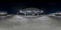 an empty parking garage at night with a skateboarder doing tricks on the ramp