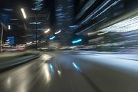 A night scene in Chicago, Illinois, showcasing its modern architecture and vibrant city life. The straight and curved roads create an intriguing urban design. Artificial lights and light streaks illuminate the concrete streets, giving a sense of motion and energy.