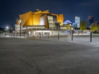 This stock photo features a stunning night shot of a modern building in Berlin. The building is beautifully illuminated with lights on its side, showcasing its striking facade. In the distance, you can see the mesmerizing city skyline, with towering skyscrapers and various tints and shades. The image captures the essence of urban architecture and city life, with the asphalt road surface and street lights adding to the urban ambiance. Perfect for projects related to modern architecture, cityscapes, and the vibrant city of Berlin in Germany.