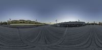 there is a fisheye image of a man riding his skateboard on the boardwalk