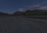the night sky is reflecting in the river water and rocks on the bank in front of a rocky mountain landscape