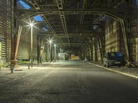 A car drives underneath a steel bridge on an empty street in Berlin, Germany. The city comes alive at night with the glow of street lights and the dark backdrop of urban buildings. A symphony of artificial lights and metal structures in Europe's vibrant capital.