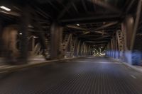 This is an image taken at night in Chicago, Illinois, USA. The city's urban architecture is showcased against the dark night sky. The roads and thoroughfares are made of asphalt and concrete, illuminated by street lights and artificial light. The motion blur of passing cars gives a sense of the city's bustling energy. Bridges and tunnels can be seen traversing the metropolitan area. The metal structures of the buildings stand tall alongside the trees. This photo captures the essence of city life in Chicago, with its vibrant urban design and light streaks.