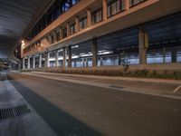 A night scene in the city, featuring an empty parking garage. A car is parked at an exit ramp, with a light reflecting on the pavement. The urban design and artificial light create a dark and atmospheric setting.