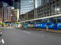 This is an image of an empty street at night in Wellington, New Zealand. The modern cityscape features skyscrapers and office buildings across the street, illuminated by artificial light. The dark street is lined with storefronts and businesses, with streetlights and traffic lights visible in the distance. This image reflects the urban design and bustling city life of Wellington after dark. It captures the atmosphere of a quiet night in the city, with a sense of tranquility and stillness. Explore the beauty of Wellington's urban landscape with this stunning photograph.