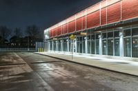 This image captures the modern architecture and urban design of a suburban area in Toronto, Canada. The photo depicts an empty parking lot with a sign indicating a red and yellow building at night. The low lighting showcases the artificial lights illuminating the building facade and street light. The surrounding area consists of office buildings, shops, and warehouses, contributing to the vibrant city life of Toronto. This photo represents the dynamic and bustling atmosphere of a modern urban settlement in Canada.