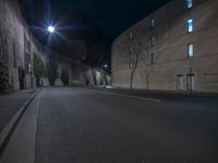 A night scene in the city with an empty street and a parked car. Street lights illuminate the urban landscape, highlighting the curve of the road. A person walks by a museum, its windows glowing with artificial light.