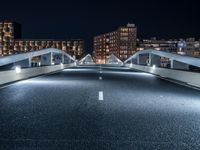This stunning stock photo features a cityscape at night, showcasing modern architecture and urban design. The image captures a highway with several bridges spanning over it, surrounded by tall buildings and residential areas. The city is illuminated by artificial light, creating a captivating view. The road surface is made of asphalt, leading straight down the road. In the foreground, there are beautiful trees and street lights, adding to the overall charm. This cityscape represents the vibrant city life of Holland, a country located in Europe. The image is perfect for illustrating concepts related to infrastructure, urban living, and the dynamic atmosphere of a bustling city.