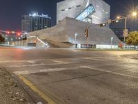 This is an image of a large concrete building in the city of Dallas, Texas. The modern architecture stands tall at a street corner, illuminated by the city lights at night. Red traffic lights signal the intersection, creating a vibrant atmosphere. The clear sky above contrasts with the dark surroundings, highlighting the urban landscape. In the foreground, a tree adds a touch of nature amidst the metropolitan area. This photo captures the essence of the business district, showcasing the combination of modern and natural elements in a cityscape.
