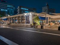 This image captures the vibrant nightlife of a coastal city in Japan. The city is illuminated by the soft glow of street lights and the artificial light from shops and restaurants. The pier and jetty extend into the dark ocean, providing incredible views of the city skyline. Coastal roads with storefronts invite visitors to explore and eat out at various restaurants. This image perfectly showcases the urban design and city life of this Japanese coastal city.