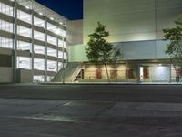 This stock photo showcases a stunning night view of a modern office building located in the bustling city of Los Angeles, California, USA. The lights inside the building illuminate the facade, creating a mesmerizing sight against the dark sky. Two trees and a stairway enhance the urban design surrounding the building. The contemporary architecture and glass windows add a touch of elegance to this urban landscape. The composition of the image highlights the contrast between the building's rectangular structure and the curving asphalt road, creating a visually captivating scene. This stock photo is ideal for representing business districts, cityscapes, and modern urban architecture in Los Angeles.