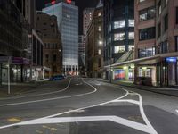 This is an image of a modern city at night. The photo showcases the illuminated high-rise buildings and skyscrapers that line the city streets. The architecture features curved windows and sleek designs. The city streets are filled with cars traveling on the asphalt roads and parked in the parking lots. The vibrant street lights brighten up the urban environment, creating a bustling atmosphere. The office buildings and storefronts represent the city's business district, while the artificial light and dark surroundings emphasize the city's nightlife. This photo captures the essence of city life and urban design.
