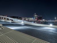 a bench on a bridge overlooking a body of water and some buildings at night time
