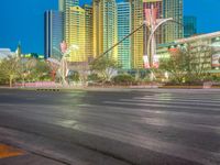 This image captures the vibrant cityscape of Las Vegas, Nevada, USA, at night. The modern architecture and towering skyscrapers dominate the scene, illuminated by the bright neon lights and streetlights. The motion blur effect adds a sense of dynamic energy to the photograph, symbolizing the fast-paced nature of the city. The urban design is enhanced by the presence of vegetation and trees, creating a harmonious balance between nature and artificial light. This photo represents the lively atmosphere and unique urban experience of Las Vegas.