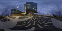 A modern office building in Toronto, Canada, illuminated by artificial light at night. People walk and cycle around the circular building, creating a vibrant urban scene. The building's architectural design and the surrounding open spaces make it a prominent feature in the city's skyline.