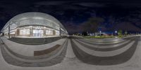 A modern architecture building in Toronto's financial district at night. The fisheye lens captures the reflection on the building's facade, creating a mesmerizing monochrome scene. The business district comes to life with artificial lights and a clear sky above.