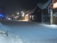Night Time in a Snowy Town with City Road and Building