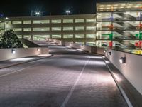 This stock photo captures a scene in Los Angeles, USA, featuring a street and stairs in a parking lot illuminated by artificial lights at night. The image showcases a well-lit suburban area with buildings and residential spaces nearby. The asphalt road leads to a driveway's entry in the parking deck. A street light further enhances the visibility in this dark suburban neighborhood. The composition emphasizes the play of light and shadows, creating a visually interesting image.