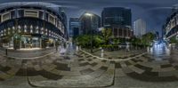 two circular fisheye photographs show people walking through a city street at night time, one with a camera facing the other