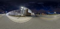 A vibrant night scene in the heart of Toronto's financial district. The fish-eye lens captures the intersection of urban architecture, artificial light, and modern design. The city's skyline is reflected in the glass facades of office buildings, creating a mesmerizing monochrome view.