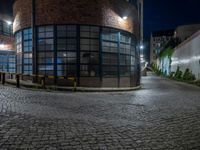 Night-time urban scene in Berlin, Germany. Classic architecture with cobblestone streets and brick walls. Artificial light illuminates a storeroom courtyard. The dark clouds contrast with the bright city lights.