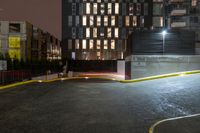 A nighttime view of a straight road in the urban city of Toronto, Canada. The street is illuminated with artificial lights from the city and parking structures. The dark night sky contrasts with the bright city lights, creating a captivating urban scene.