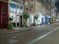 This stock photo captures the stunning night view of Amsterdam, a vibrant city in Holland, Europe. The image shows the illuminated buildings and houses with lights shining through the windows. The city's residential areas and neighborhoods can be seen, along with the bustling streets and infrastructure, including the well-lit roads, curbs, and street lights. The photo showcases the urban design and architecture of Amsterdam, with shops, stores, and storefronts adding to the lively atmosphere. The image also features the beautiful vegetation and flowers, adding a touch of natural beauty to the urban setting. Experience the charm of city life in Amsterdam, Netherlands, through this captivating stock photo.