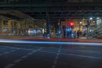 A night view of Berlin, Germany. The city's buildings and streets are illuminated by artificial light, creating a stunning display of light streaks and tints. Motion blur captures the energy of the urban environment.