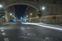A night view of Berlin, Germany. The city streets are illuminated by street lights and the glow of buildings, creating a captivating urban landscape. The dark night sky contrasts with the artificial light from street lamps.