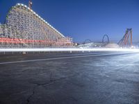 an empty parking lot near a roller coaster at night time, with long exposure of light coming from cars
