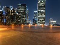 This stunning stock photo features an empty cement parking lot with a city in the distance at night on a rainy night. The image showcases the beautiful cityscape of Los Angeles, USA, with its futuristic architecture and modern office buildings. Illuminated by artificial light, the city looks vibrant and full of life. The clear sky and street lights add to the overall beauty of the urban landscape. The open space of the parking lot provides a sense of urban design and modernity. This image perfectly captures the essence of city life and the bustling business district of Los Angeles.