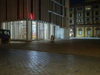 This stock photo features a car parked in front of an empty building at night in Berlin, Germany. The cityscape showcases modern architecture with an open space, windows, and artificial lighting. The building has a classic architecture design and is located in a business district. The cobblestone street and urban design add to the ambiance of the image. The photo captures the essence of city life and urban aesthetics in Europe.