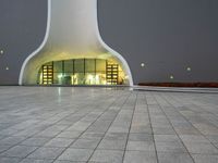 This stock photo features a modern building with a white facade illuminated at night in Taichung, Taiwan. The building stands out with its contemporary architecture design. In the foreground, there is a small paved area that adds to the overall appeal. The city of Taichung, located in Taiwan, is known for its remarkable modern architectural landmarks, and this building is a great example. This image can be used to illustrate the beauty of modern architecture in Taiwan or to depict the vibrant cityscape of Taichung at night.