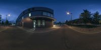 A night view of a road corner in Toronto, Canada. Urban architecture and artificial light create a cityscape. The building to the left contrasts with the open space and street lights. A dark, urban scene.