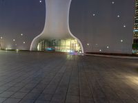 This image shows a modern clock tower in Taichung, Taiwan, set against a dark night sky. The tower is located in an open space that highlights the impressive architecture. The surrounding buildings are illuminated by artificial light, creating a striking contrast with the night sky. The surface of the plaza is well-maintained, with pavers creating a smooth and inviting walkway. In the distance, street lights illuminate the busy streets of Taipei, showcasing the vibrant city life in Taiwan. This photo captures the beauty and modernity of Taiwan's architecture in the evening.
