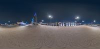 the walkway at night with buildings in the background and a full moon overhead is a mirror effect